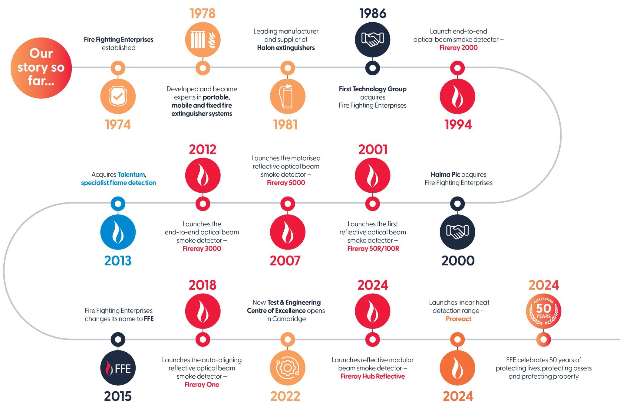 From our beginnings in 1974, FFE Ltd has grown into a global company, specialising in fire safety technology. We’ve reached key milestones along the way, from developing cutting-edge beam smoke detectors to launching linear heat detection systems, always striving to stay at the forefront of innovation.